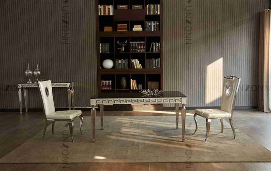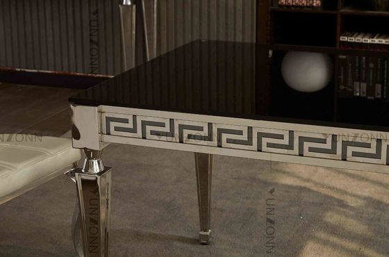 Bàn kính đen ngắn gọn với cạnh chạm khắc và chân góc cho phòng ăn