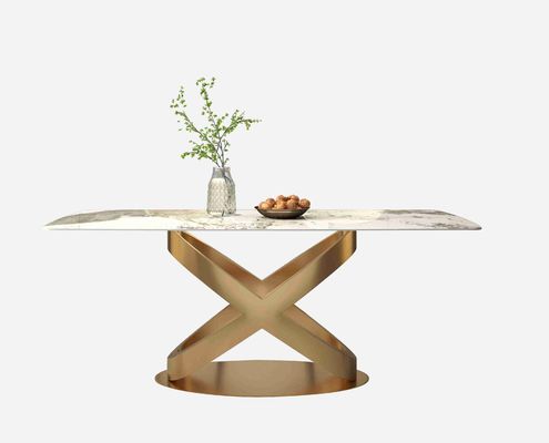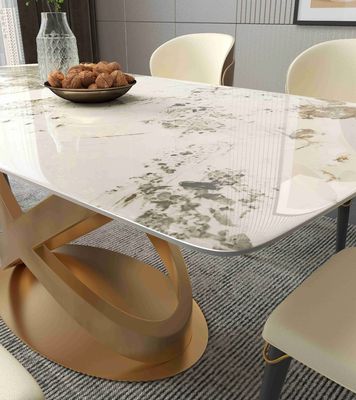 Bàn ăn bằng đá hình chữ nhật màu trắng hiện đại với bệ đồng thiết kế mới