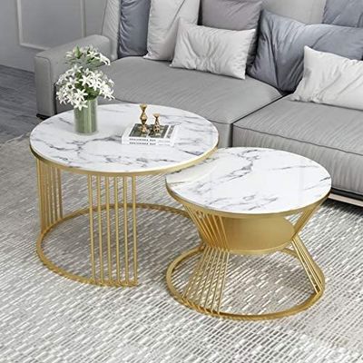 Bàn cà phê tròn trên mặt kính bằng đá cẩm thạch với bàn cà phê vàng
