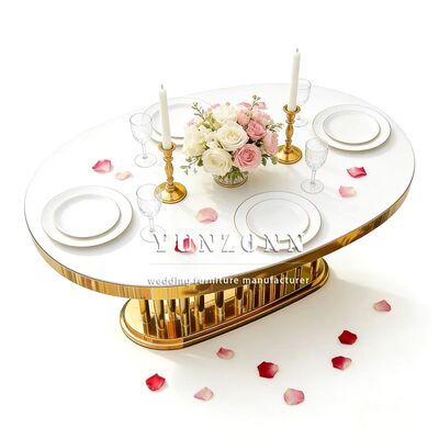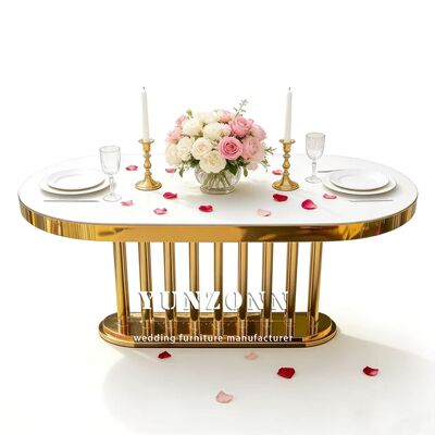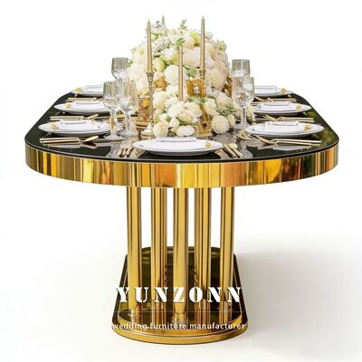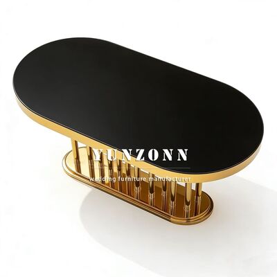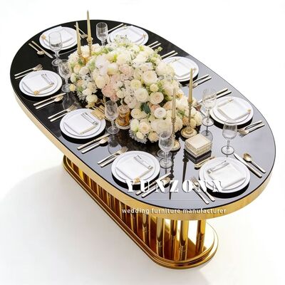 | Tên sản phẩm: | Bàn ăn dài khách sạn bằng thép không gỉ mạ vàng hình oval, mặt kính trắng cho đám cưới |