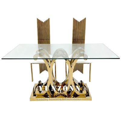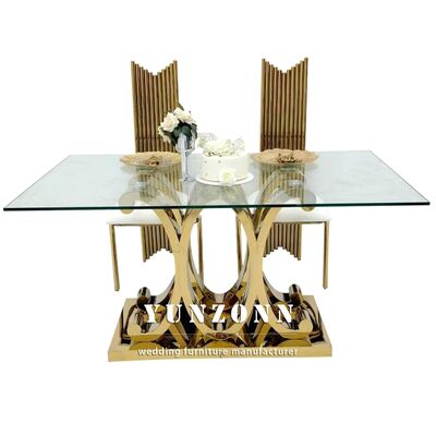 | Tên sản phẩm: | Bàn ăn hình chữ nhật bằng kính trang trí sang trọng hiện đại chân vàng bộ bàn thép không gỉ cho sự kiện tiệc cưới |